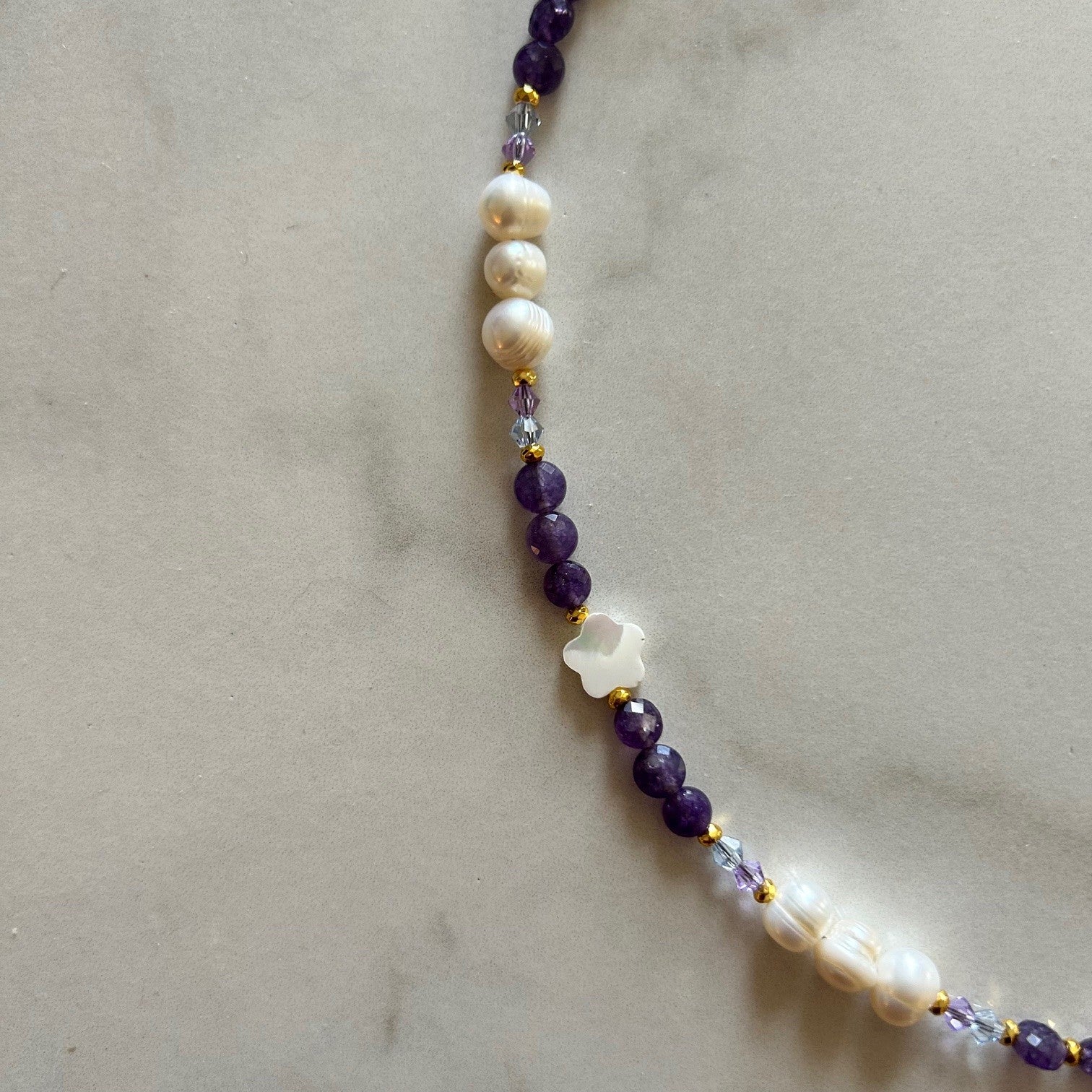✧ faceted amethyst round coin beads, fresh-water pearls, + white mother of pearl flower beads