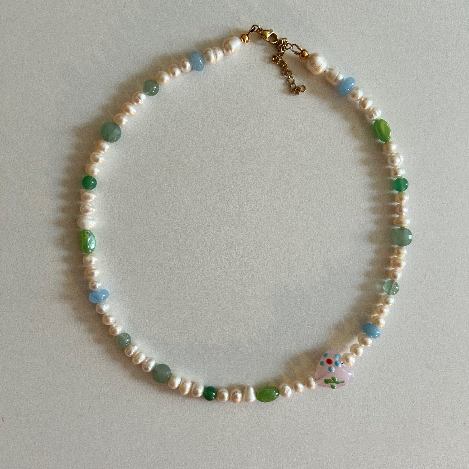step into a world of enchantment with this charming piece that's as lively as your imagination. imagine lustrous pearls dancing among vibrant green beads, like little leaves swaying in the breeze. but the real star? a single glass pink heart bead, glowing like a hidden gem in the garden. whether you're navigating life's twists and turns or simply adding a touch of floral charm to your everyday style, the garden blossom pearl necklace is your perfect companion. so go ahead, embrace the magic all around you and let your heart bloom with every step!
