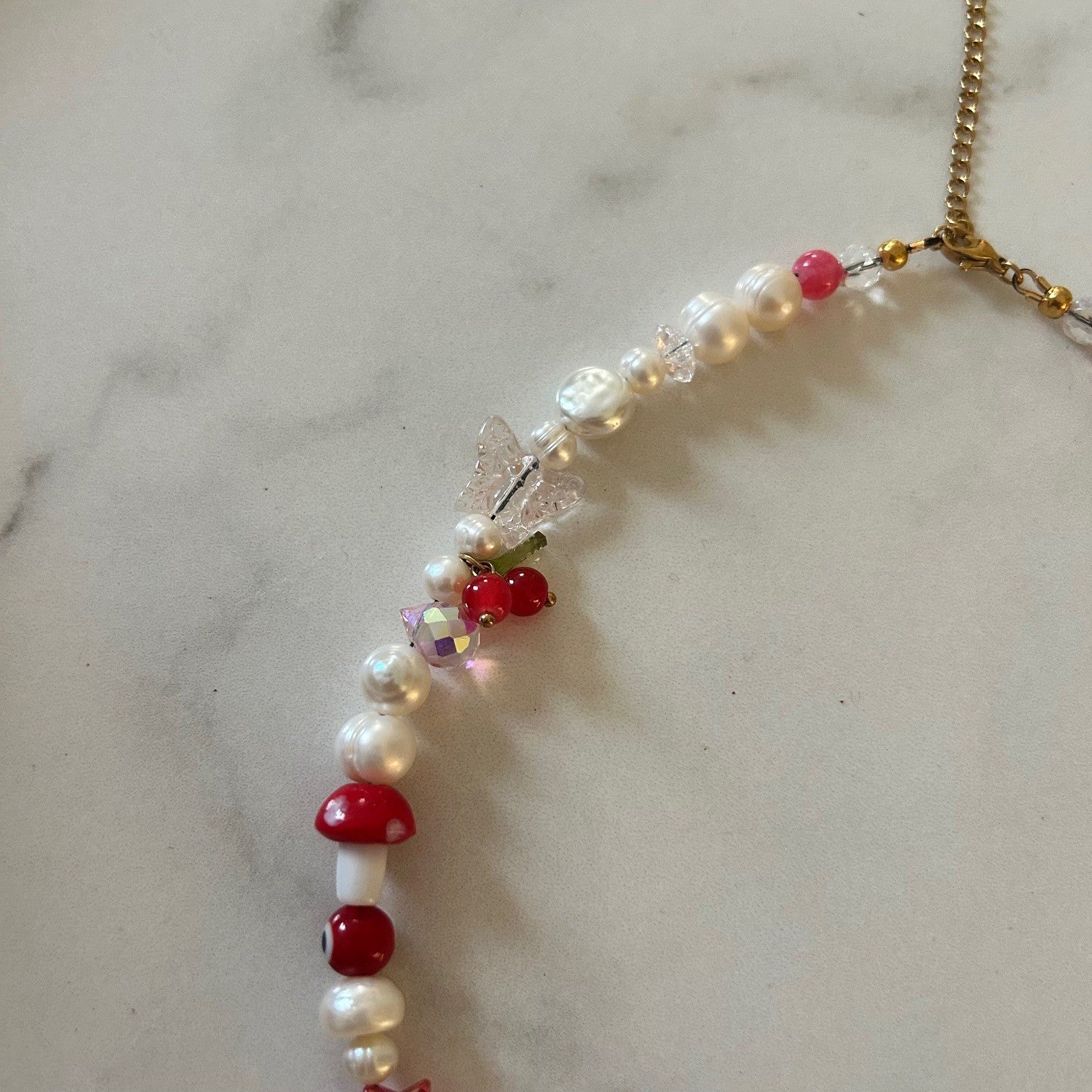 a cozy cottagecore dream strung with real freshwater pearls, glossy red glass beads, and the most adorable lil lampwork chicken bead you’ve ever seen. like… are you kidding?! this cluck queen is ready to rule all your fits. perfect for sipping iced chai in a knit cardigan, reading manifesting tiktoks in the park, or just living your main character farm fairytale fantasy.