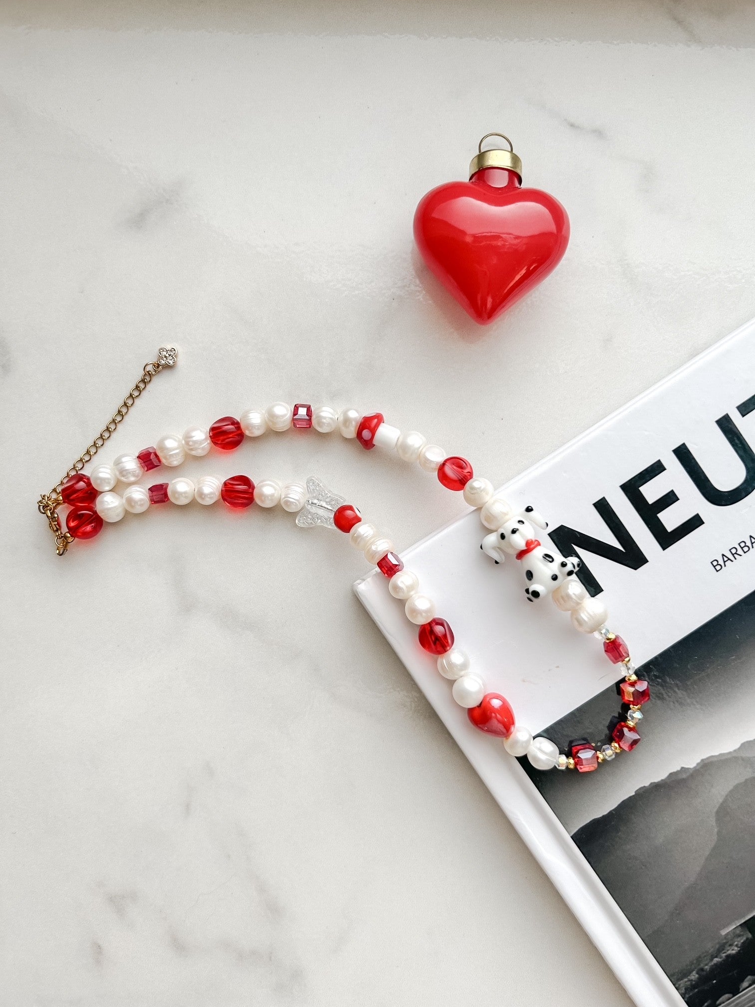 a playful mix of charm and elegance. lucky features vibrant red glass beads paired with lustrous freshwater pearls, finished with a sweet red heart accent—your new everyday talisman.