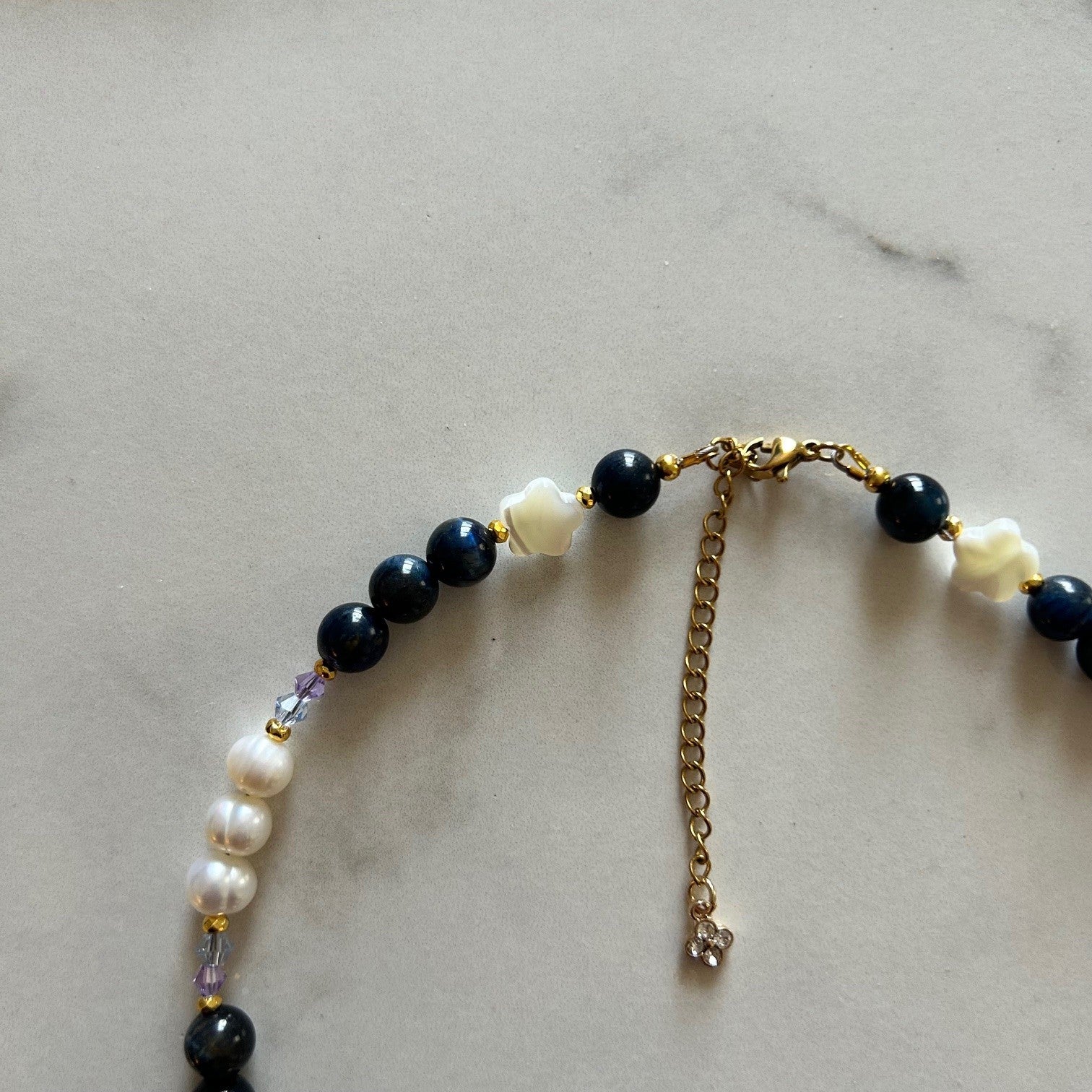 ✧ dark blue dyed tiger's eye beads, fresh-water pearls, + white mother of pearl flower beads